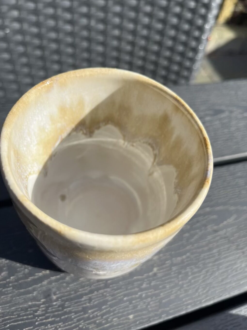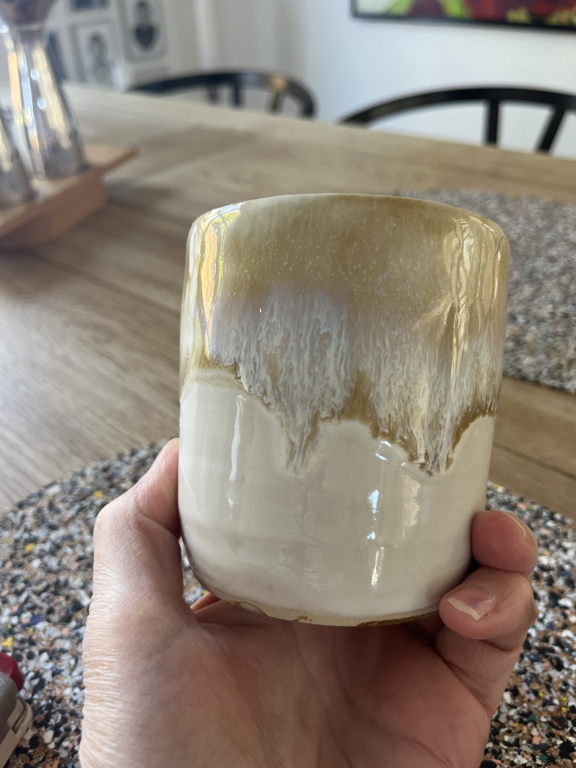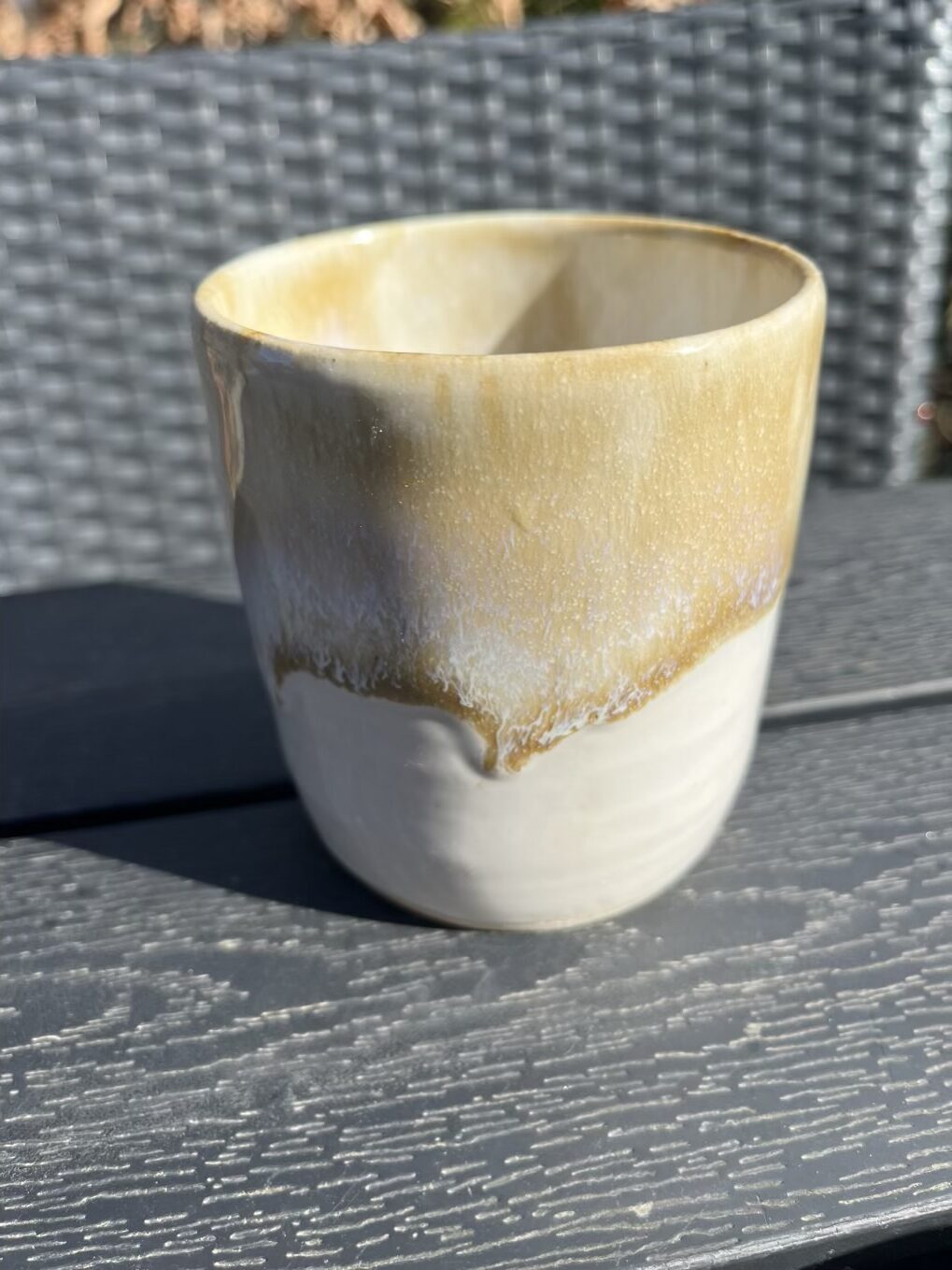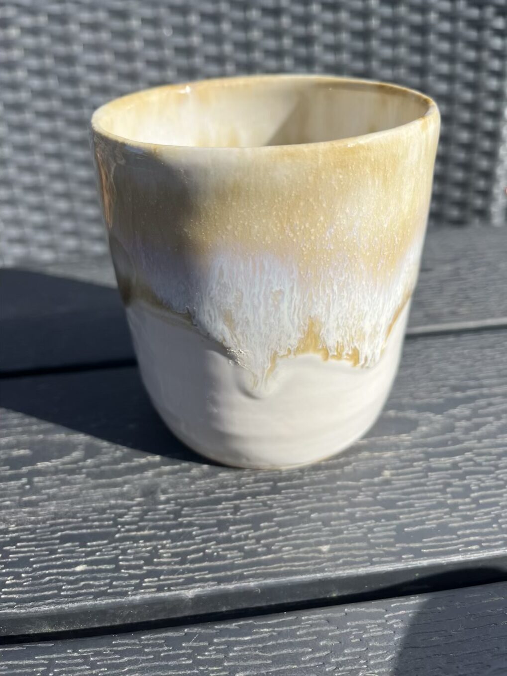Fin stor kop uden hank creme hvid med en gyldenbrun glasur der smelter ned af koppen.